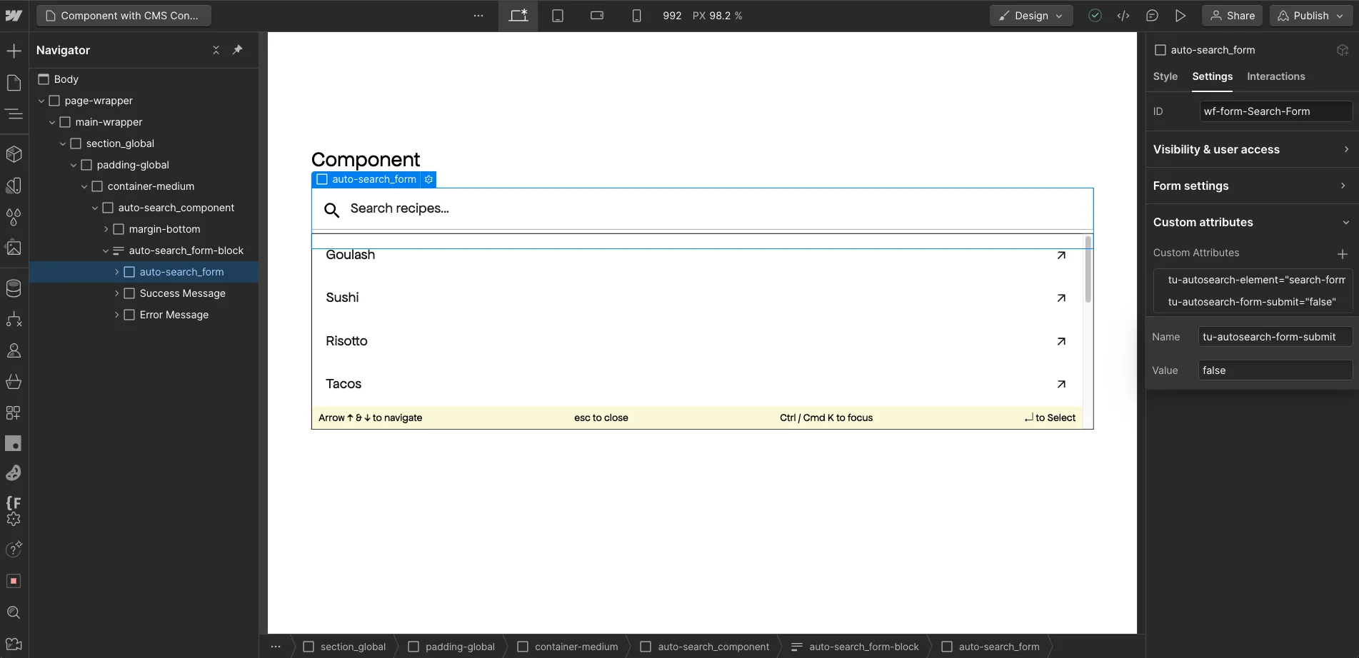 {"type":"@webflow/XscpData","payload":{"nodes":[{"_id":"6f0ee72e-f922-e99d-715f-d34132bb9e28","type":"Block","tag":"div","classes":["1542230a-4fa4-2037-2781-dd0c07bc4a02"],"children":["66f5a524-ae88-ccf9-8b0b-032d38359fbf","27aee5bd-3203-1012-e389-e7e57ac0cb55"],"data":{"text":false,"tag":"div","devlink":{"runtimeProps":{},"slot":""},"displayName":"","attr":{"id":""},"xattr":[],"search":{"exclude":false},"visibility":{"conditions":[]}}},{"_id":"66f5a524-ae88-ccf9-8b0b-032d38359fbf","type":"Block","tag":"div","classes":["a1815a70-6730-2b00-0a8a-c20b4badbf0f","17ad419a-7f8c-fc20-70e3-10c37f919f3b"],"children":["1a777d85-ea62-a11c-9aff-07216c50cc9b"],"data":{"text":false,"tag":"div","devlink":{"runtimeProps":{},"slot":""},"displayName":"","attr":{"id":""},"xattr":[],"search":{"exclude":false},"visibility":{"conditions":[]}}},{"_id":"1a777d85-ea62-a11c-9aff-07216c50cc9b","type":"Heading","tag":"h2","classes":["07815991-952a-8d98-0e00-e4c25af27133"],"children":["a53fe40b-a7a5-36d4-7952-ee98ba0e6cde"],"data":{"tag":"h2","devlink":{"runtimeProps":{},"slot":""},"displayName":"","attr":{"id":""},"xattr":[],"search":{"exclude":false},"visibility":{"conditions":[]}}},{"_id":"a53fe40b-a7a5-36d4-7952-ee98ba0e6cde","text":true,"v":"Component"},{"_id":"27aee5bd-3203-1012-e389-e7e57ac0cb55","type":"FormWrapper","tag":"div","classes":["1824d781-e130-df44-15e1-80a0aab7d88d"],"children":["404cf0e9-d8a8-e077-ab8c-a9a80f08335f","e1f9a653-98eb-5d93-17e3-da6d3361ee6e","94173443-c281-d8e6-b30d-733bbf6acae0"],"data":{"search":{"exclude":true},"form":{"type":"wrapper"},"devlink":{"runtimeProps":{},"slot":""},"displayName":"","attr":{"id":""},"xattr":[],"visibility":{"conditions":[]}}},{"_id":"404cf0e9-d8a8-e077-ab8c-a9a80f08335f","type":"FormForm","tag":"form","classes":["47197db5-b4d2-cd6c-1ac1-1d034fc5a3bd"],"children":["2e4f9f9a-0ec1-c723-0c97-67a70950957d","ee86d3fd-66bc-d585-1d81-5e21588a8f37","046efb8a-8ff4-a297-8af6-c273ae0ea5db"],"data":{"Source":{"tag":"Default form","val":{}},"form":{"type":"form","name":"Search Form"},"attr":{"id":"wf-form-Search-Form","name":"wf-form-Search-Form","data-name":"Search Form","redirect":"","data-redirect":"","action":"","method":"get"},"devlink":{"runtimeProps":{},"slot":""},"displayName":"","xattr":[{"name":"tu-autosearch-element","value":"search-form"},{"name":"tu-autosearch-form-submit","value":"false"}],"search":{"exclude":false},"visibility":{"conditions":[]}}},{"_id":"2e4f9f9a-0ec1-c723-0c97-67a70950957d","type":"Block","tag":"div","classes":["7ae308a8-59d0-9aea-f2e6-b173b84f30a0"],"children":["e33921b7-2089-08c4-6af4-94de594e7200","6209e30f-8263-f2fb-4c7f-0f2b48ac7d59"],"data":{"text":false,"tag":"div","devlink":{"runtimeProps":{},"slot":""},"displayName":"","attr":{"id":""},"xattr":[],"search":{"exclude":false},"visibility":{"conditions":[]}}},{"_id":"e33921b7-2089-08c4-6af4-94de594e7200","type":"FormTextInput","tag":"input","classes":["07815991-952a-8d98-0e00-e4c25af2713a","7ae308a8-59d0-9aea-f2e6-b173b84f30a4"],"children":[],"data":{"form":{"name":"Search Input 2","type":"input","passwordPage":false},"attr":{"id":"Search-Input-2","name":"Search-Input-2","maxlength":256,"data-name":"Search Input 2","placeholder":"Search recipes...","disabled":false,"type":"text","required":false,"autofocus":false},"devlink":{"runtimeProps":{},"slot":""},"displayName":"","xattr":[{"name":"tu-autosearch-element","value":"search-input"}],"search":{"exclude":false},"visibility":{"conditions":[]}}},{"_id":"6209e30f-8263-f2fb-4c7f-0f2b48ac7d59","type":"Block","tag":"div","classes":["7ae308a8-59d0-9aea-f2e6-b173b84f30a1"],"children":["aa7273cc-d762-b5de-52d6-623d34723634"],"data":{"text":false,"tag":"div","devlink":{"runtimeProps":{},"slot":""},"displayName":"","attr":{"id":""},"xattr":[],"search":{"exclude":false},"visibility":{"conditions":[]}}},{"_id":"aa7273cc-d762-b5de-52d6-623d34723634","type":"HtmlEmbed","tag":"div","classes":["7ae308a8-59d0-9aea-f2e6-b173b84f30a2"],"children":[],"v":"<svg xmlns=\"http://www.w3.org/2000/svg\" xmlns:xlink=\"http://www.w3.org/1999/xlink\" aria-hidden=\"true\" role=\"img\" class=\"iconify iconify--ic\" width=\"100%\" height=\"100%\" preserveAspectRatio=\"xMidYMid meet\" viewBox=\"0 0 24 24\"><path fill=\"currentColor\" d=\"M15.5 14h-.79l-.28-.27a6.5 6.5 0 0 0 1.48-5.34c-.47-2.78-2.79-5-5.59-5.34a6.505 6.505 0 0 0-7.27 7.27c.34 2.8 2.56 5.12 5.34 5.59a6.5 6.5 0 0 0 5.34-1.48l.27.28v.79l4.25 4.25c.41.41 1.08.41 1.49 0s.41-1.08 0-1.49zm-6 0C7.01 14 5 11.99 5 9.5S7.01 5 9.5 5S14 7.01 14 9.5S11.99 14 9.5 14\"></path></svg>","data":{"search":{"exclude":false},"embed":{"meta":{"html":"<svg xmlns=\"http://www.w3.org/2000/svg\" xmlns:xlink=\"http://www.w3.org/1999/xlink\" aria-hidden=\"true\" role=\"img\" class=\"iconify iconify--ic\" width=\"100%\" height=\"100%\" preserveAspectRatio=\"xMidYMid meet\" viewBox=\"0 0 24 24\"><path fill=\"currentColor\" d=\"M15.5 14h-.79l-.28-.27a6.5 6.5 0 0 0 1.48-5.34c-.47-2.78-2.79-5-5.59-5.34a6.505 6.505 0 0 0-7.27 7.27c.34 2.8 2.56 5.12 5.34 5.59a6.5 6.5 0 0 0 5.34-1.48l.27.28v.79l4.25 4.25c.41.41 1.08.41 1.49 0s.41-1.08 0-1.49zm-6 0C7.01 14 5 11.99 5 9.5S7.01 5 9.5 5S14 7.01 14 9.5S11.99 14 9.5 14\"></path></svg>","div":false,"script":false,"compilable":false,"iframe":false},"type":"html"},"insideRTE":false,"devlink":{"runtimeProps":{},"slot":""},"displayName":"","attr":{"id":""},"xattr":[],"visibility":{"conditions":[]}}},{"_id":"ee86d3fd-66bc-d585-1d81-5e21588a8f37","type":"Block","tag":"div","classes":["07815991-952a-8d98-0e00-e4c25af27118","421d17ec-1e91-accb-916b-bb6178885058"],"children":["5896867b-c34b-19c1-46ee-ad77913b1121"],"data":{"text":true,"tag":"div","devlink":{"runtimeProps":{},"slot":""},"displayName":"","attr":{"id":""},"xattr":[],"search":{"exclude":false},"visibility":{"conditions":[]}}},{"_id":"5896867b-c34b-19c1-46ee-ad77913b1121","text":true,"v":"Try searching Tacos, Risotto, Crepes"},{"_id":"046efb8a-8ff4-a297-8af6-c273ae0ea5db","type":"Block","tag":"div","classes":["52c21438-1ec3-b6b0-3ee0-71d791